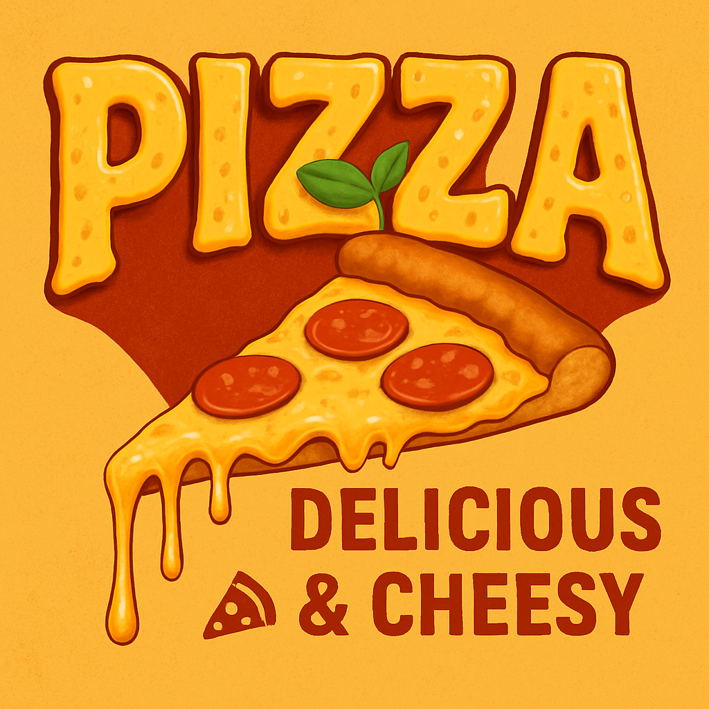 Vibrant and fun pizza-themed illustration featuring a slice and playful typography, ideal for food-related branding or marketing materials.