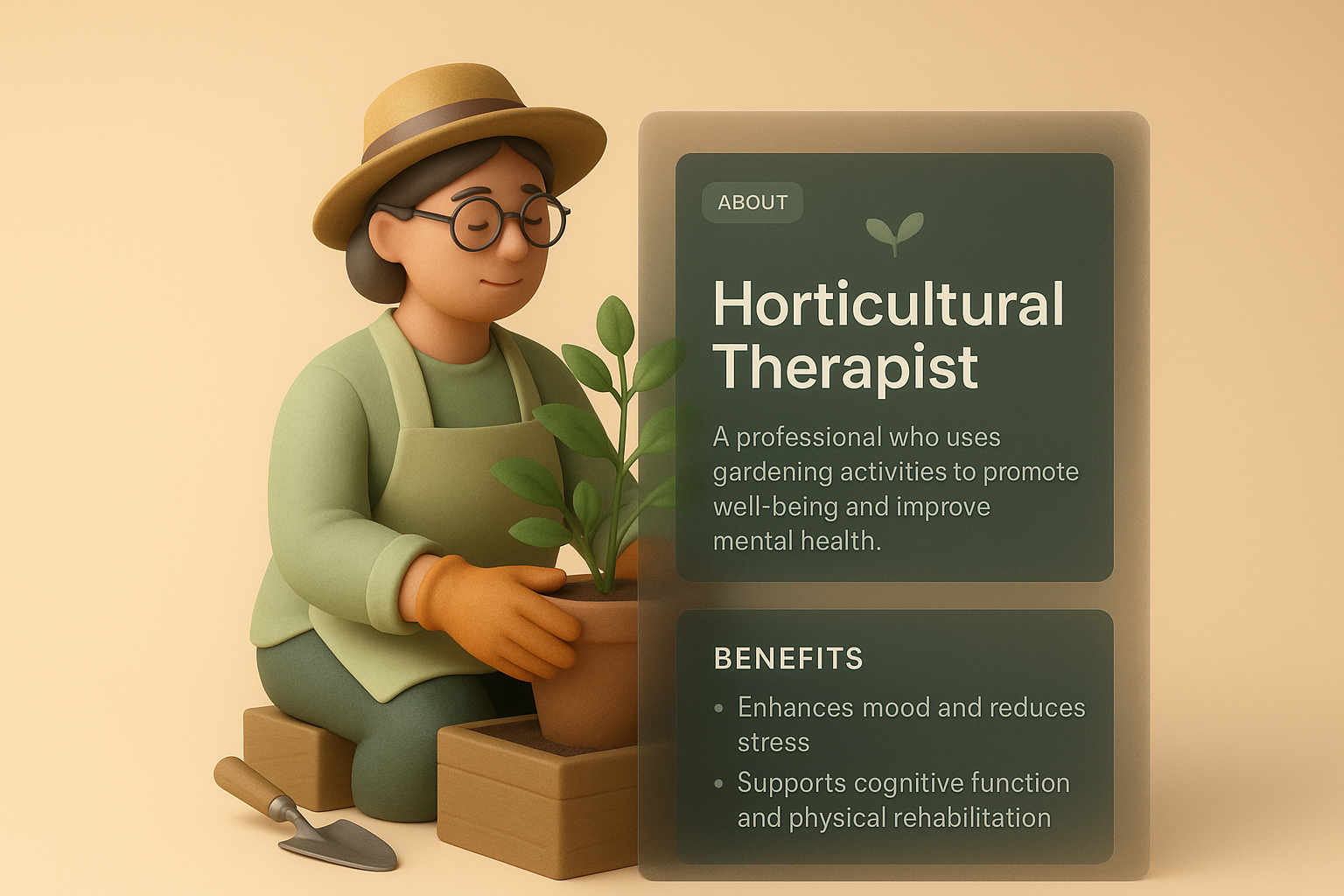 /Collection: /by davooda/Type: PNG/A 3D illustration of a horticultural therapist tending to a plant, accompanied by an informative block detailing their benefits. The design features a soft gradient background with a cohesive, light aesthetic.
