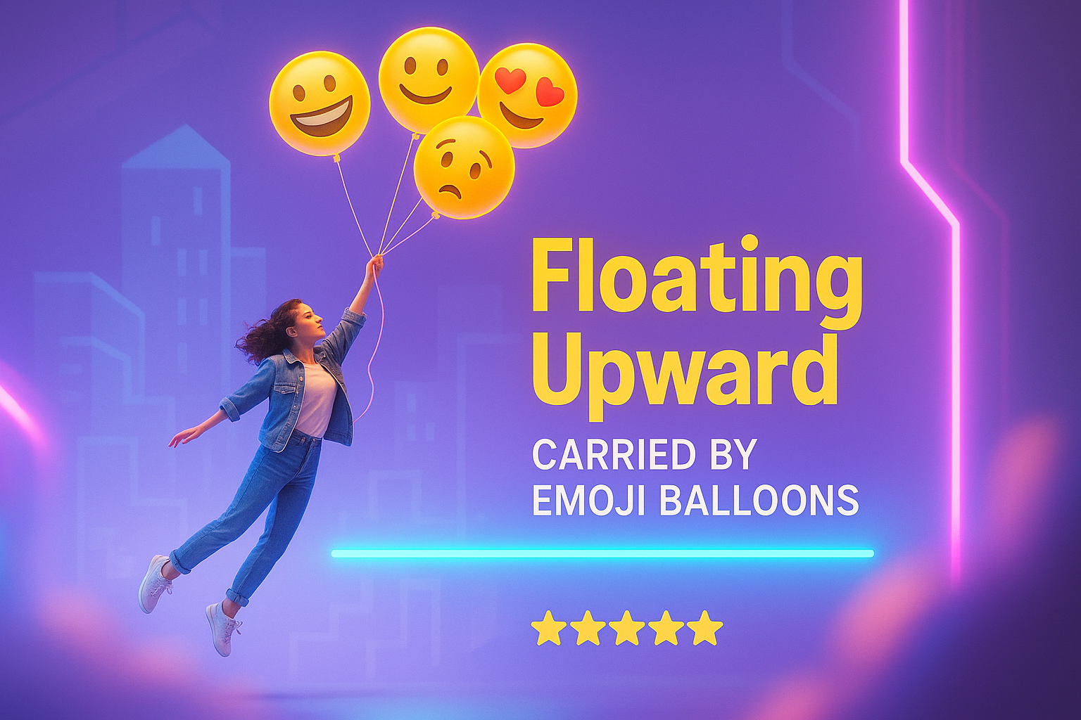 Playful Illustration of a Girl Floating with Emoji Balloons