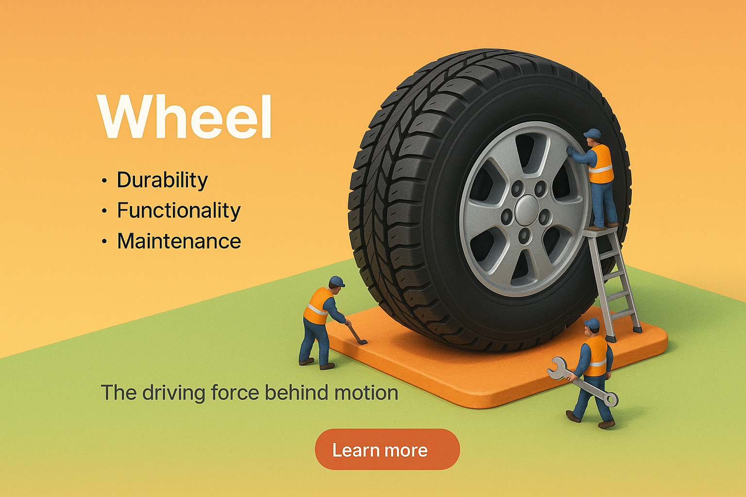 A detailed 3D scene featuring a large wheel with miniature figures performing maintenance tasks. The vibrant background transitions smoothly, enhancing the realistic effect.