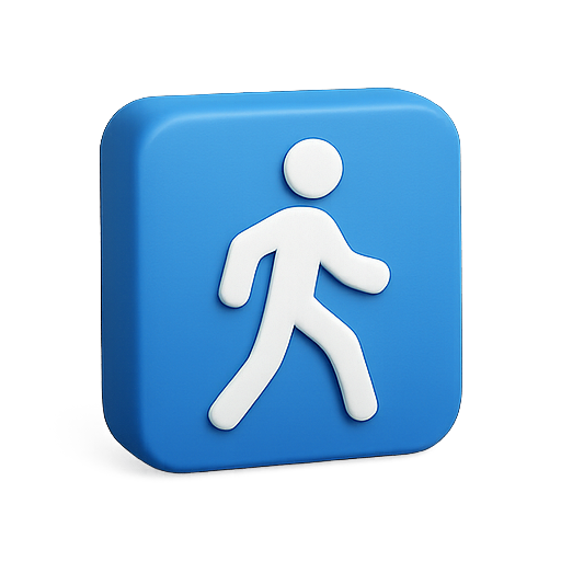 A modern, minimalist icon depicting a walking figure on a blue background. This graphic is suitable for applications related to health, fitness, or navigation, conveying movement and activity.