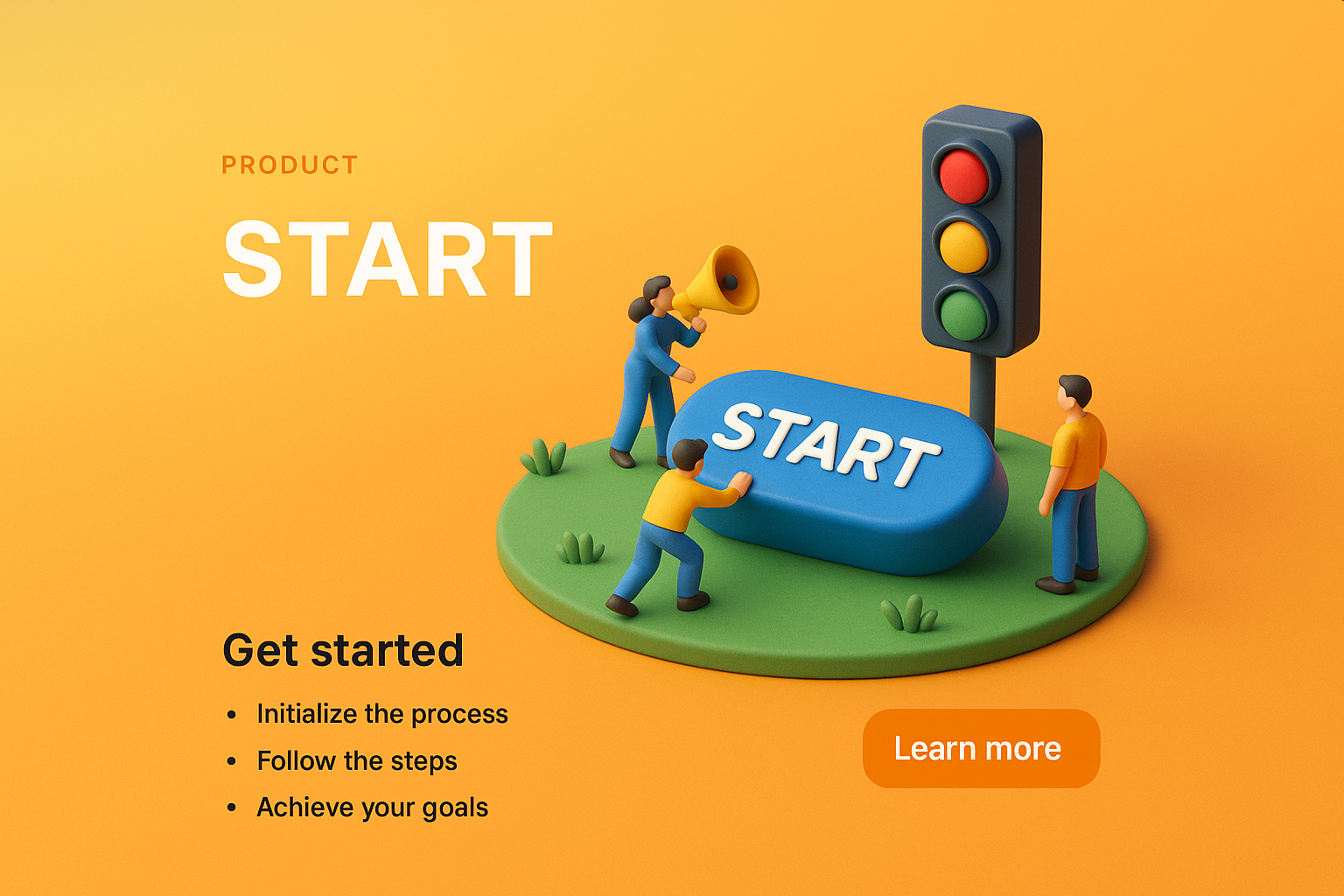 /Collection: /by davooda/Type: PNG/A vibrant 3D illustration featuring small figures engaged in activities around a large button labeled 'START'. The background is a smooth gradient transitioning to a solid color, enhancing the playful atmosphere.