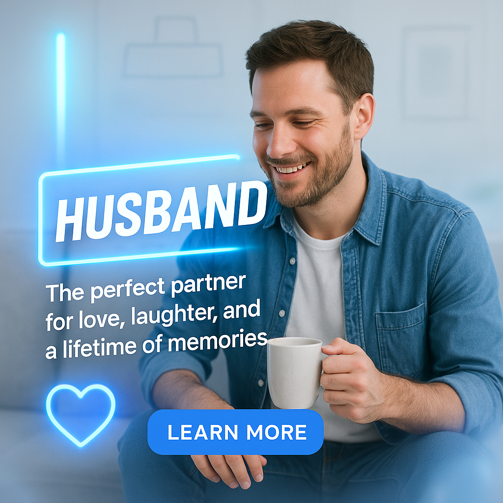 /Collection: /by davooda/Type: PNG/Engaging social media post featuring a smiling man with a coffee cup, promoting the idea of a husband as a loving partner, ideal for relationship-focused content.