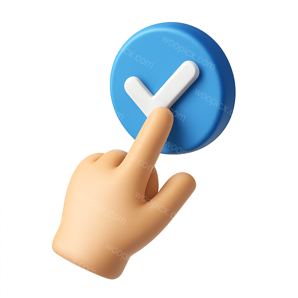/Premium/Collection: /by davooda/Type: PNG/A stylized 3D illustration of a hand reaching out to touch a blue circular button featuring a white checkmark, designed with a volumetric and isometric perspective.