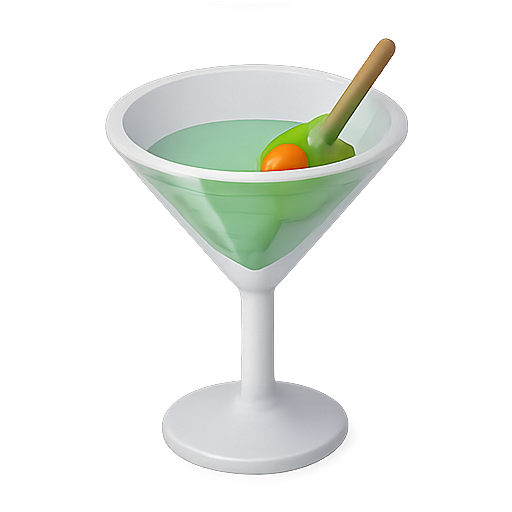 A modern illustration of a martini glass filled with a vibrant green liquid, garnished with an olive and a stirrer. Ideal for cocktail menus, bar promotions, or party invitations.