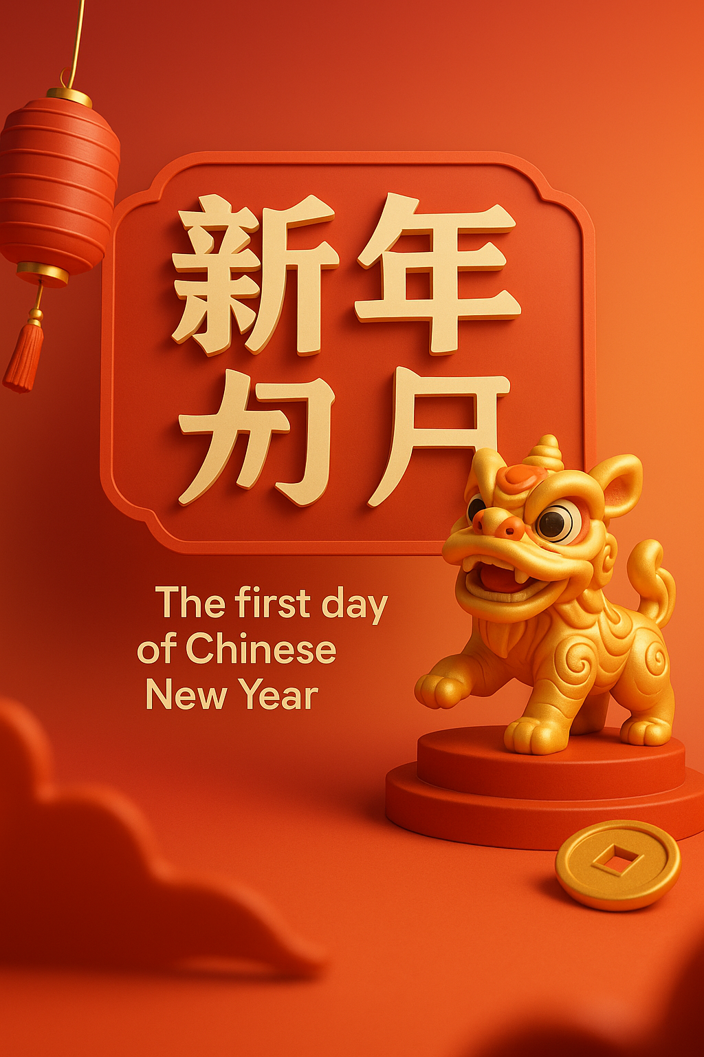 /Collection: /by davooda/Type: PNG/This image features a festive design celebrating the first day of Chinese New Year, showcasing a lion figurine and traditional decorations. Ideal for cultural promotions.
