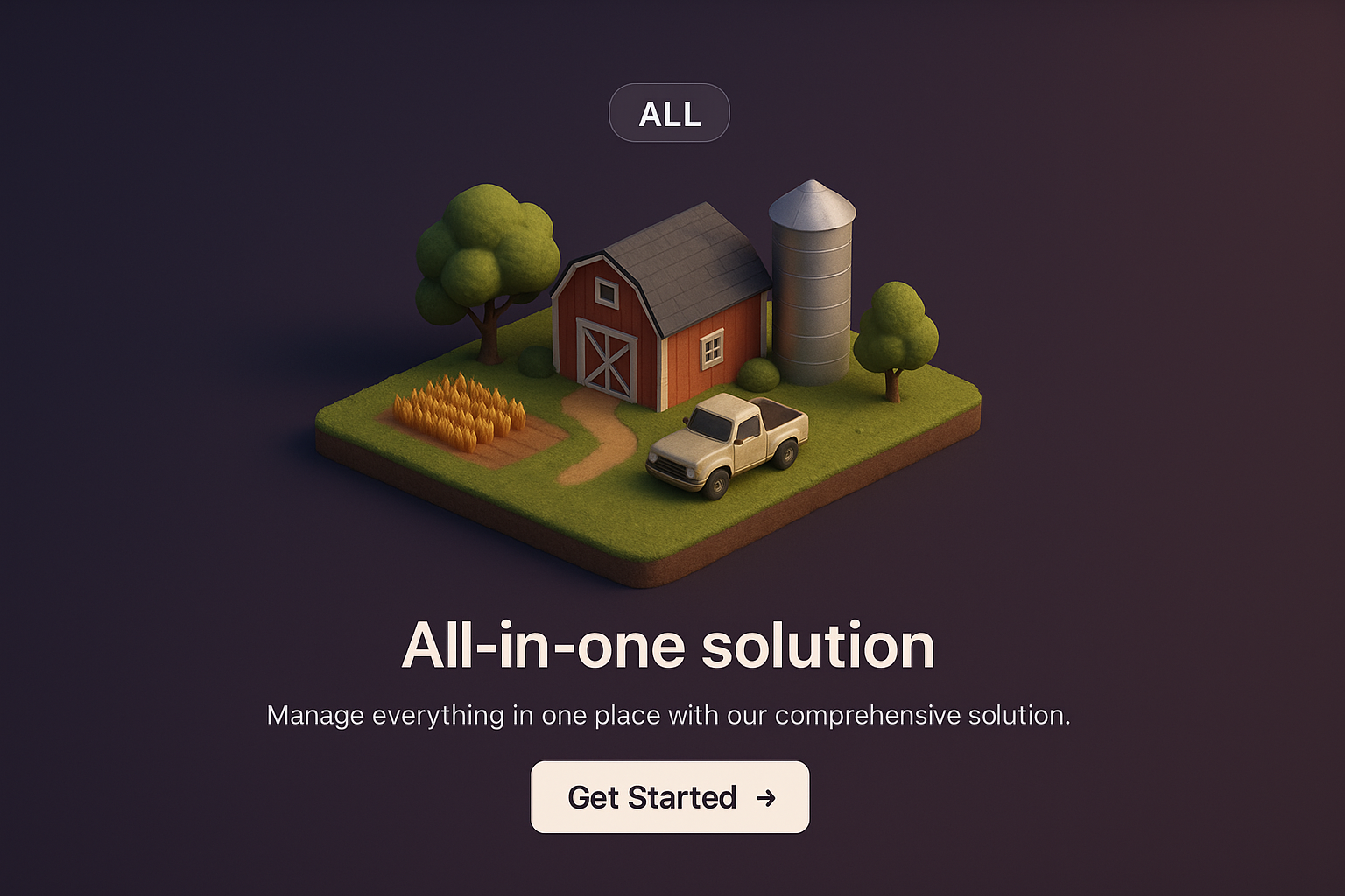 A detailed 3D representation of a small farm scene, featuring a barn, silo, and car, all set against a dark gradient background with text elements inviting users to engage.