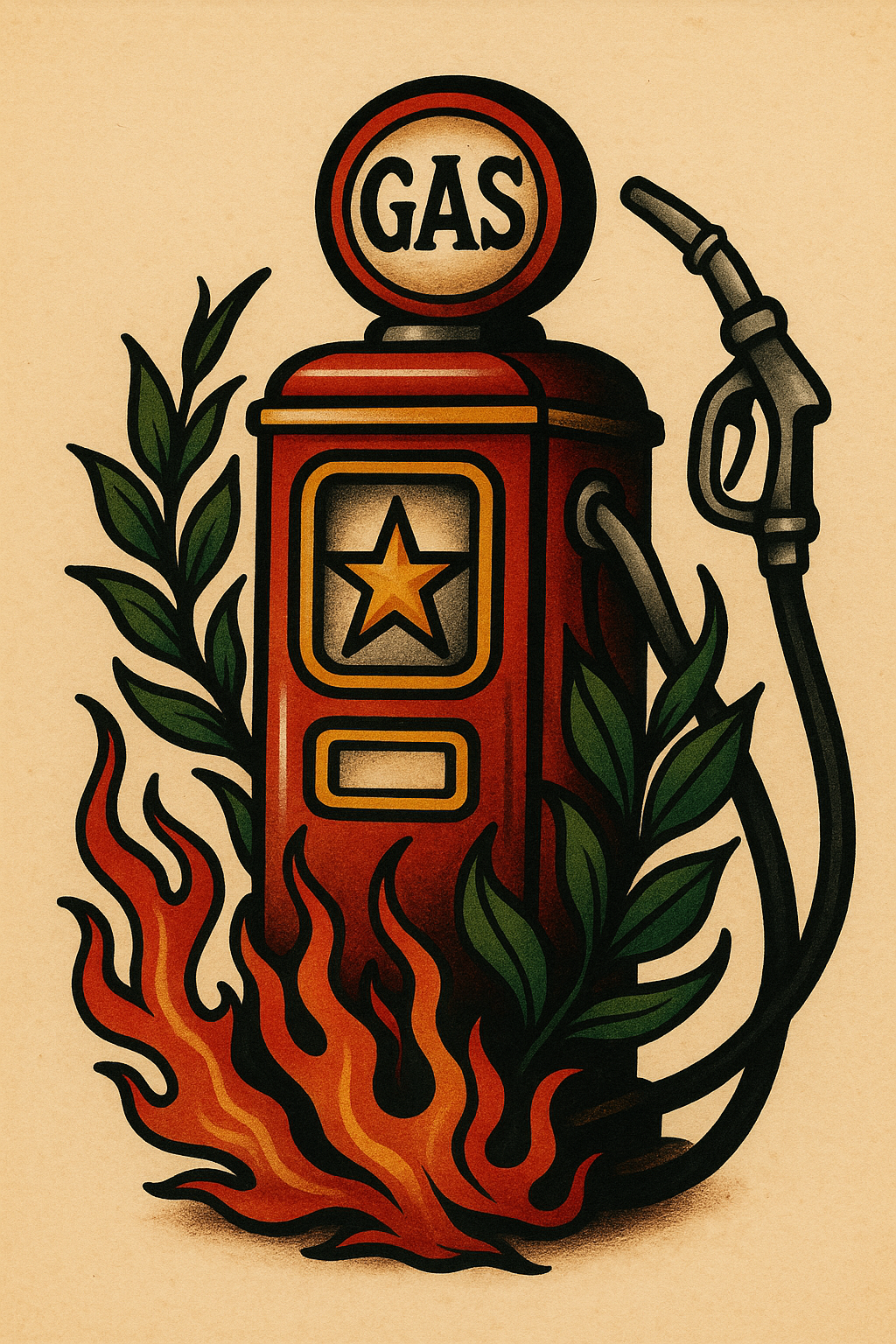 A stylized illustration of a vintage gas pump surrounded by flames and foliage, showcasing a retro design. Ideal for art prints or automotive-themed décor.