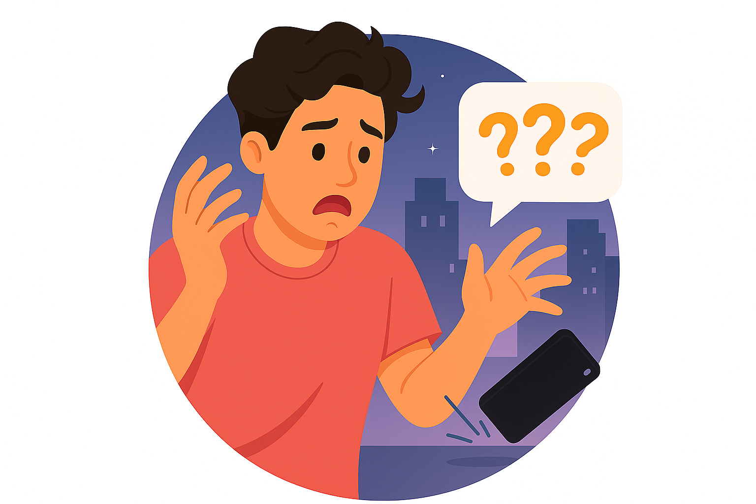 /Collection: /by davooda/Type: PNG/Digital illustration depicting a confused young man looking at a falling smartphone, featuring a cartoonish style suitable for social media or blogs.