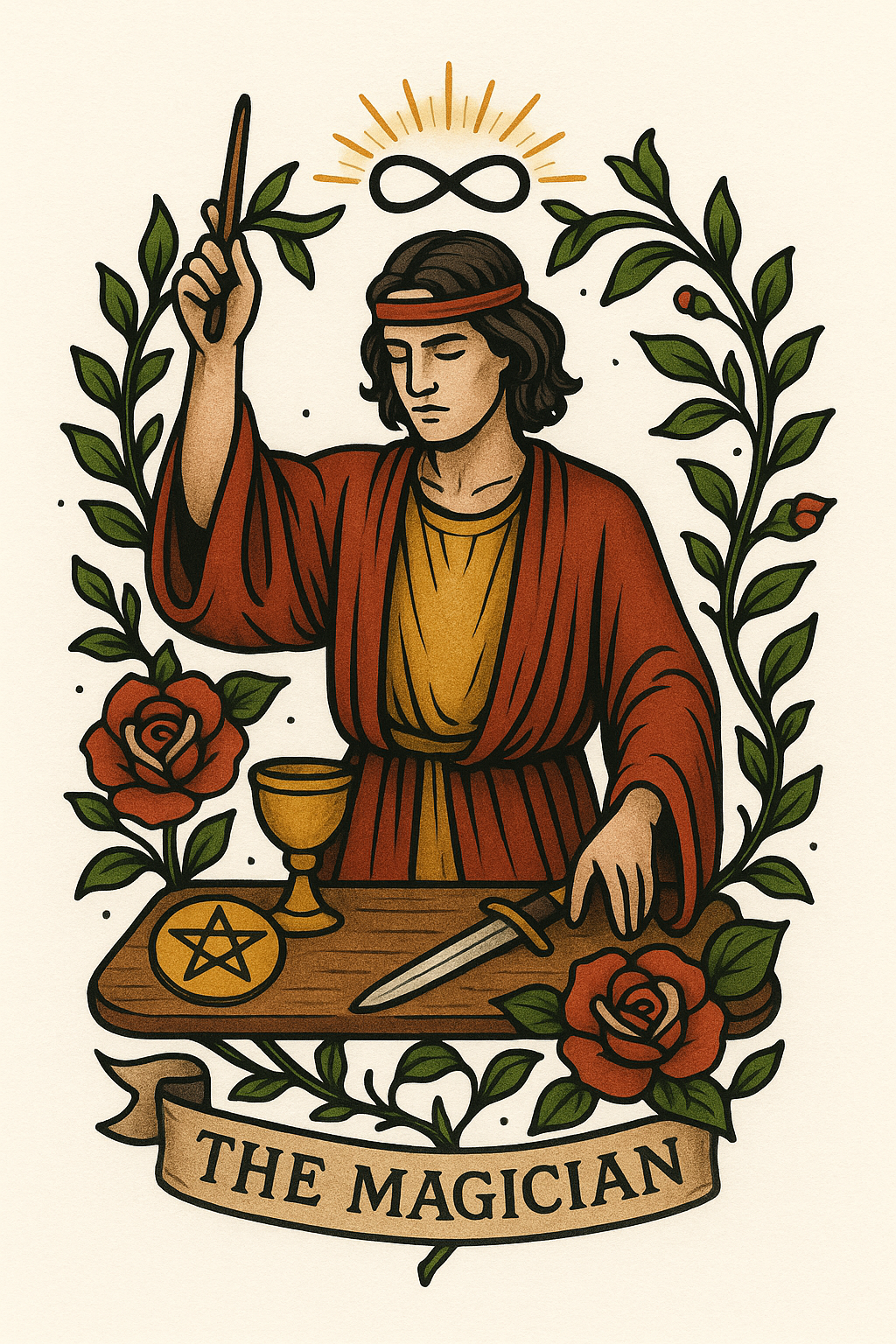 /Collection: /by davooda/Type: PNG/An artistic depiction of The Magician tarot card, featuring vibrant colors and detailed illustrations of symbolic elements. Ideal for tarot enthusiasts and spiritual art.