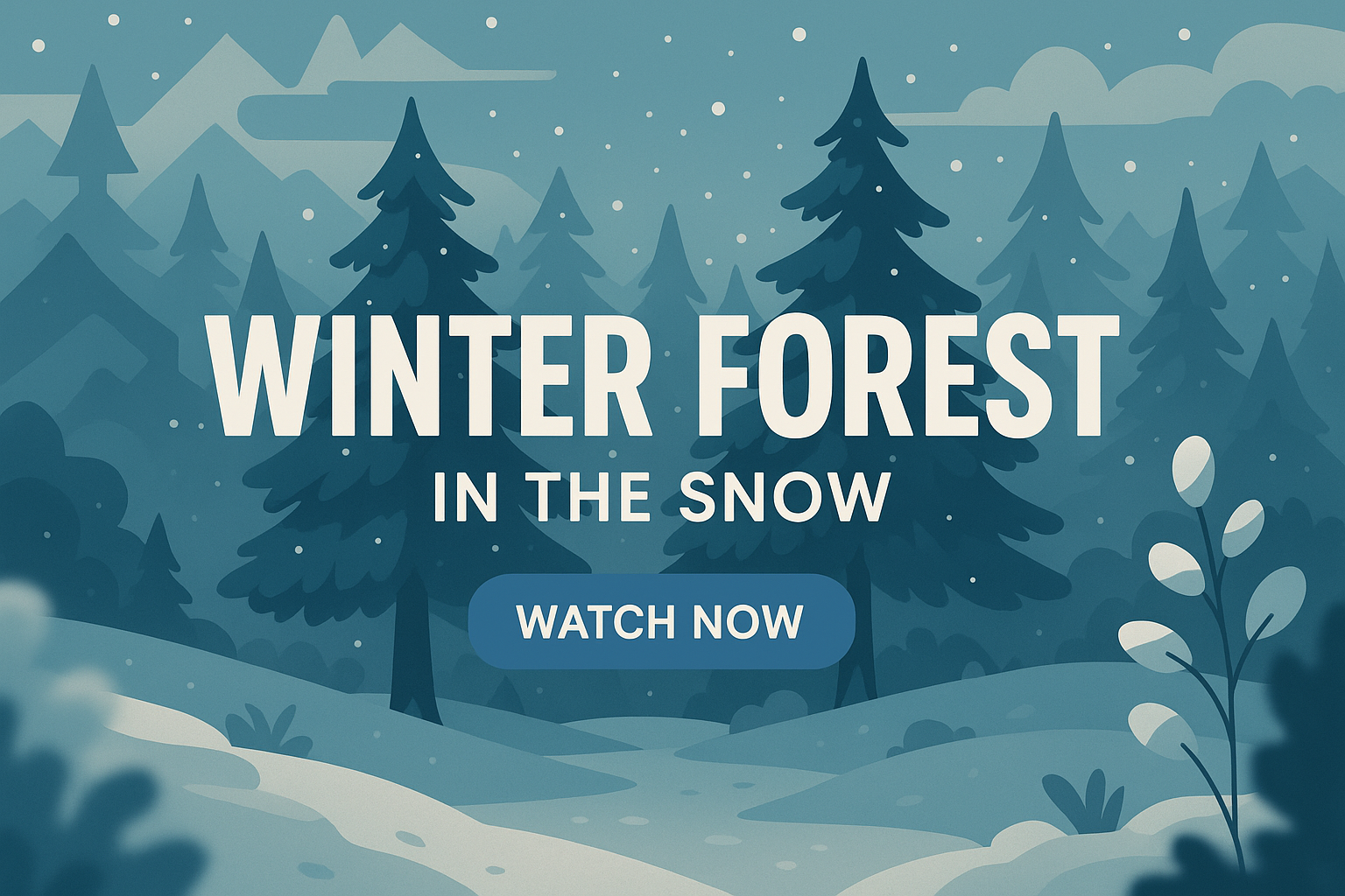 /Collection: /by davooda/Type: PNG/A serene winter forest illustration featuring snow-covered trees and mountains, designed for a promotional video or blog post. The cool color palette evokes a tranquil atmosphere.