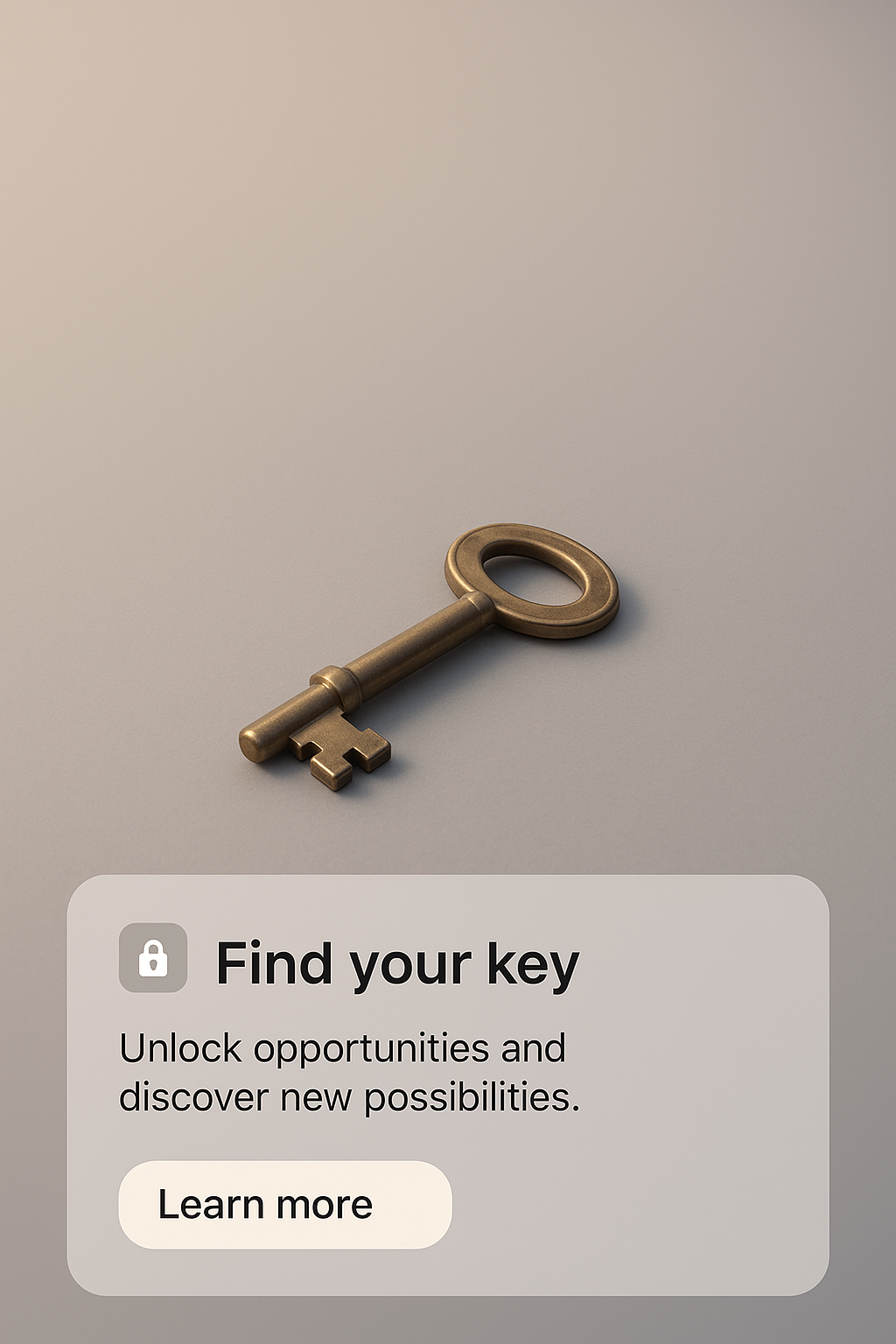 A zoomed-out view of a realistic bronze key set against a smooth gradient background. An action button invites users to engage with the content, enhancing the overall design.