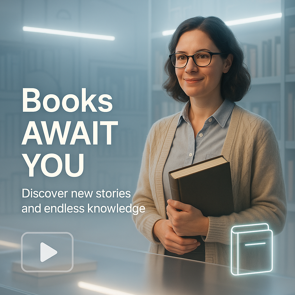 /Collection: /by davooda/Type: PNG/Engaging promotional image featuring a woman holding a book, surrounded by bookshelves, designed to inspire curiosity about reading and knowledge. Ideal for educational campaigns.