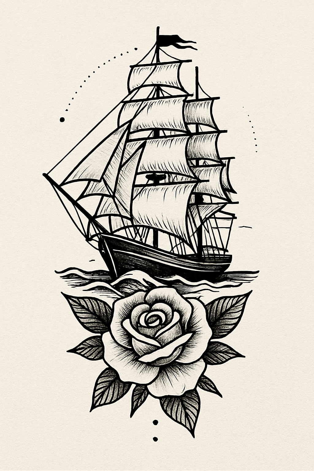 Traditional Tattoo Art Featuring a Sailing Ship and Roses