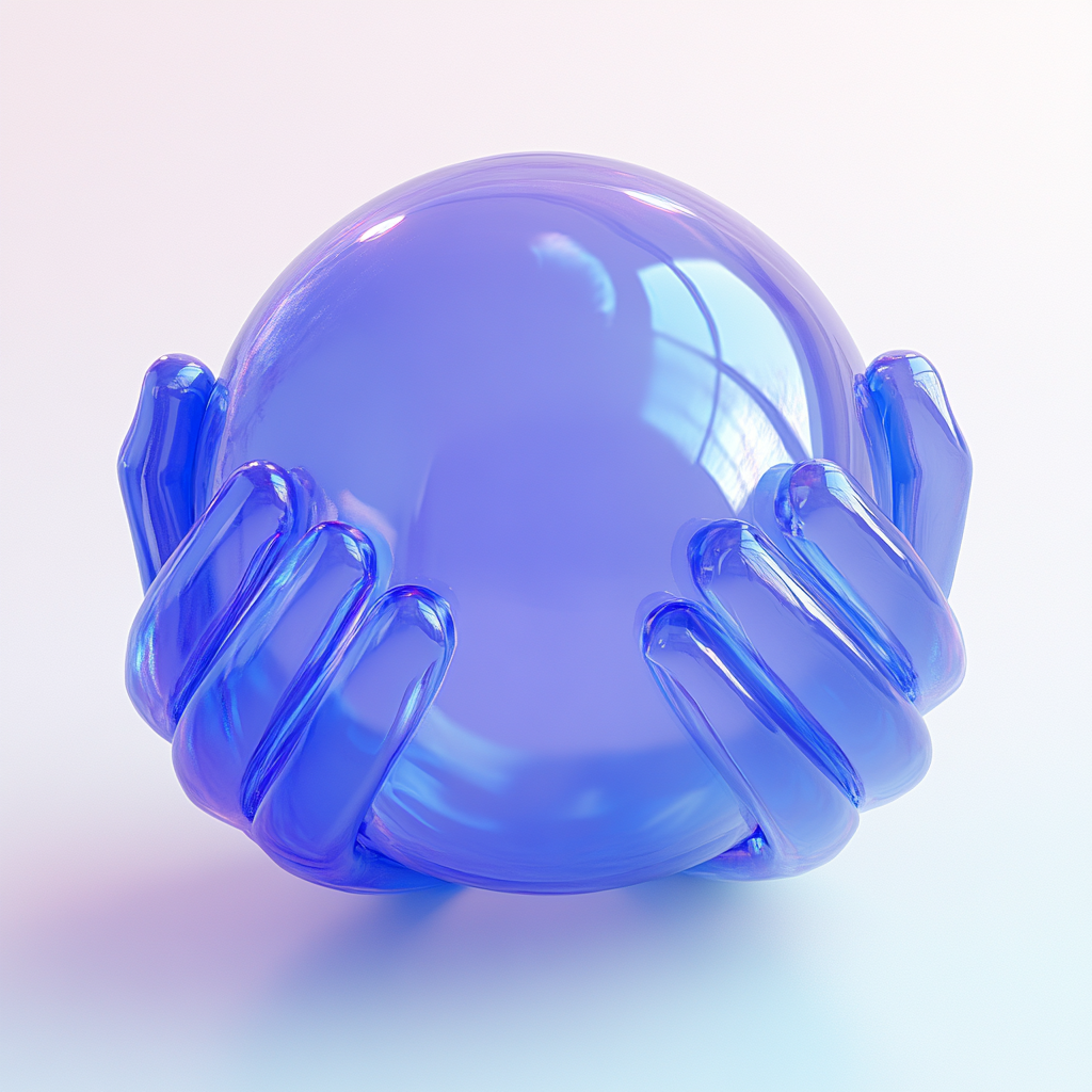 A modern and artistic 3D rendering of a translucent blue sphere supported by stylized hands. The design evokes a sense of protection and care, making it suitable for themes of wellness, innovation, or technology.