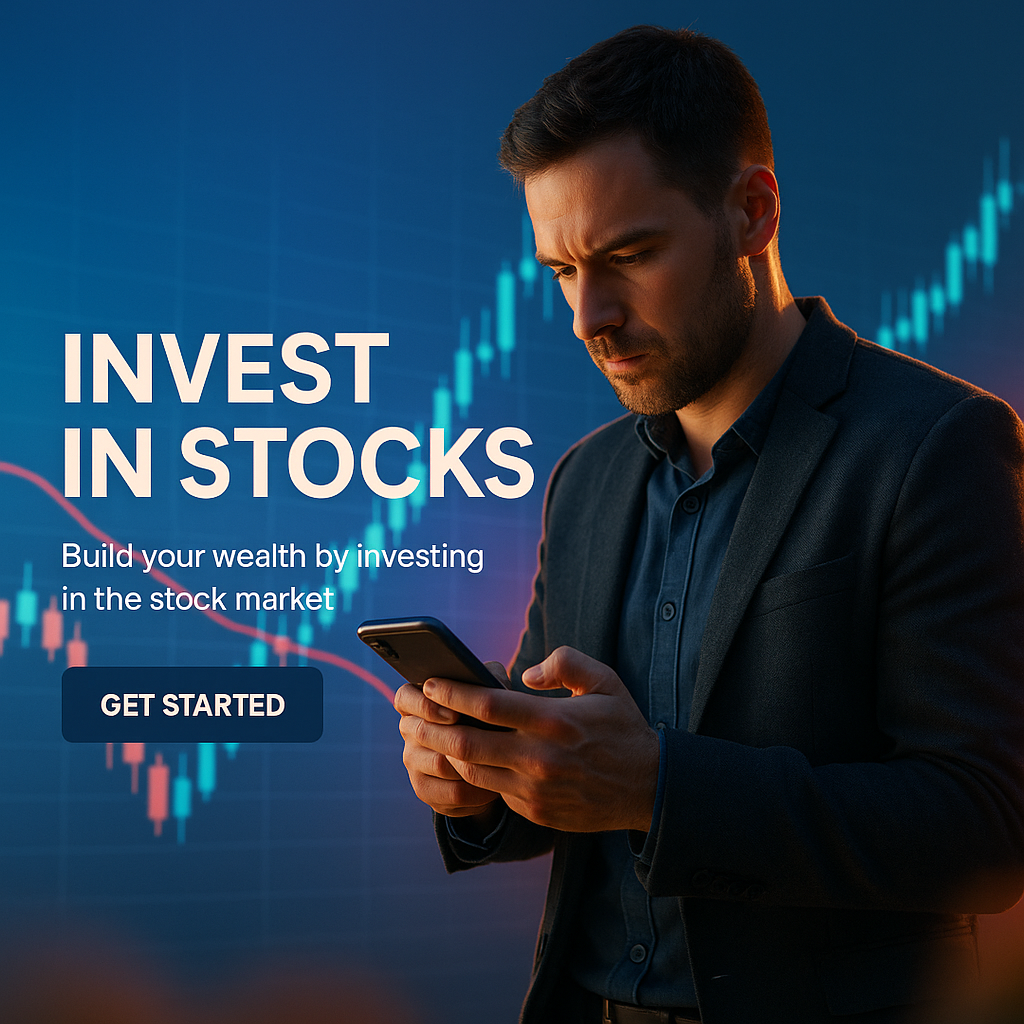 /Collection: /by davooda/Type: PNG/This is a promotional social media post designed to encourage investment in the stock market. It features a man using a smartphone with financial graphs in the background, combining a modern and professional aesthetic.
