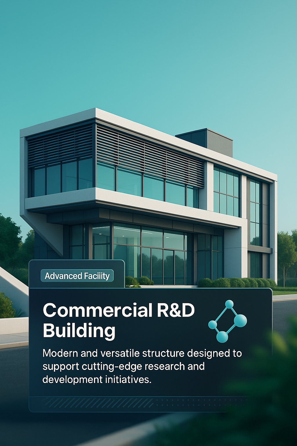 /Collection: /by davooda/Type: PNG/A sleek and contemporary R&D building featuring large glass windows and a smooth façade, set against a gradient background. The design emphasizes modern architecture and functionality.