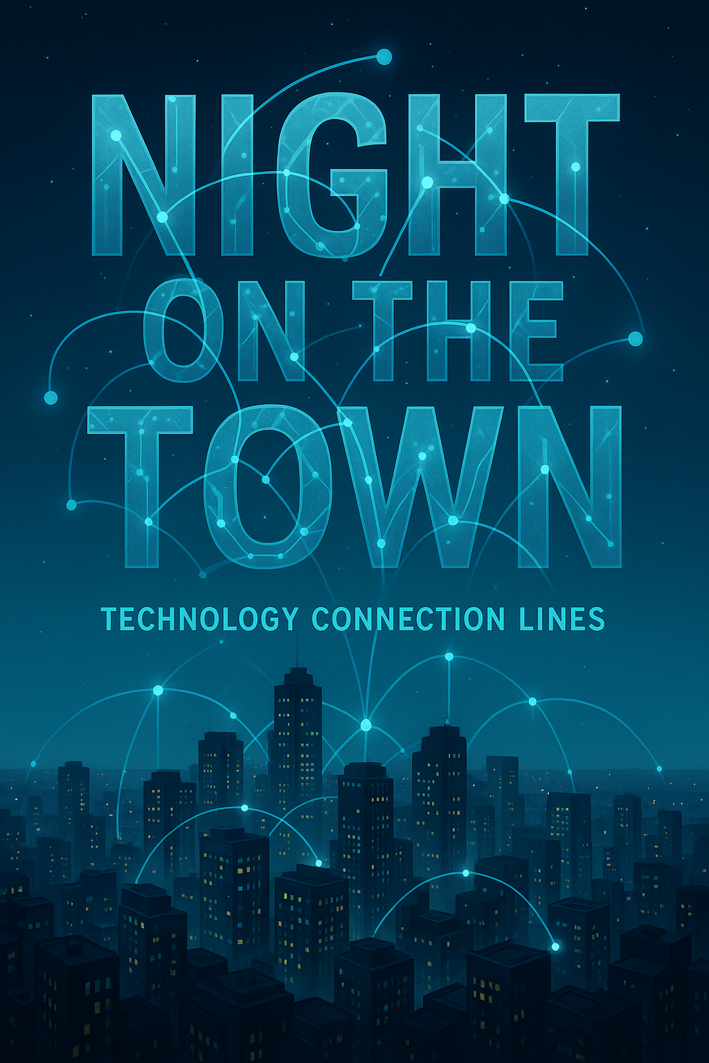 A visually striking digital artwork depicting a cityscape at night, enhanced with technology connection lines, ideal for tech-themed events or marketing.