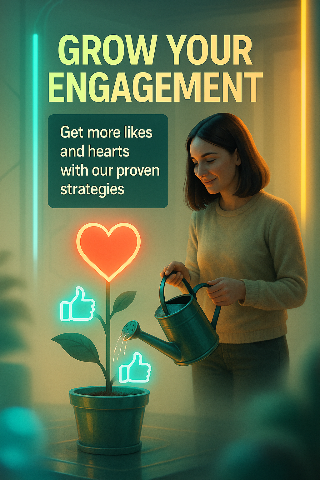 /Collection: /by davooda/Type: PNG/A visually appealing graphic illustrating engagement growth through a nurturing metaphor. The design combines glowing icons and a warm color palette, ideal for social media marketing.