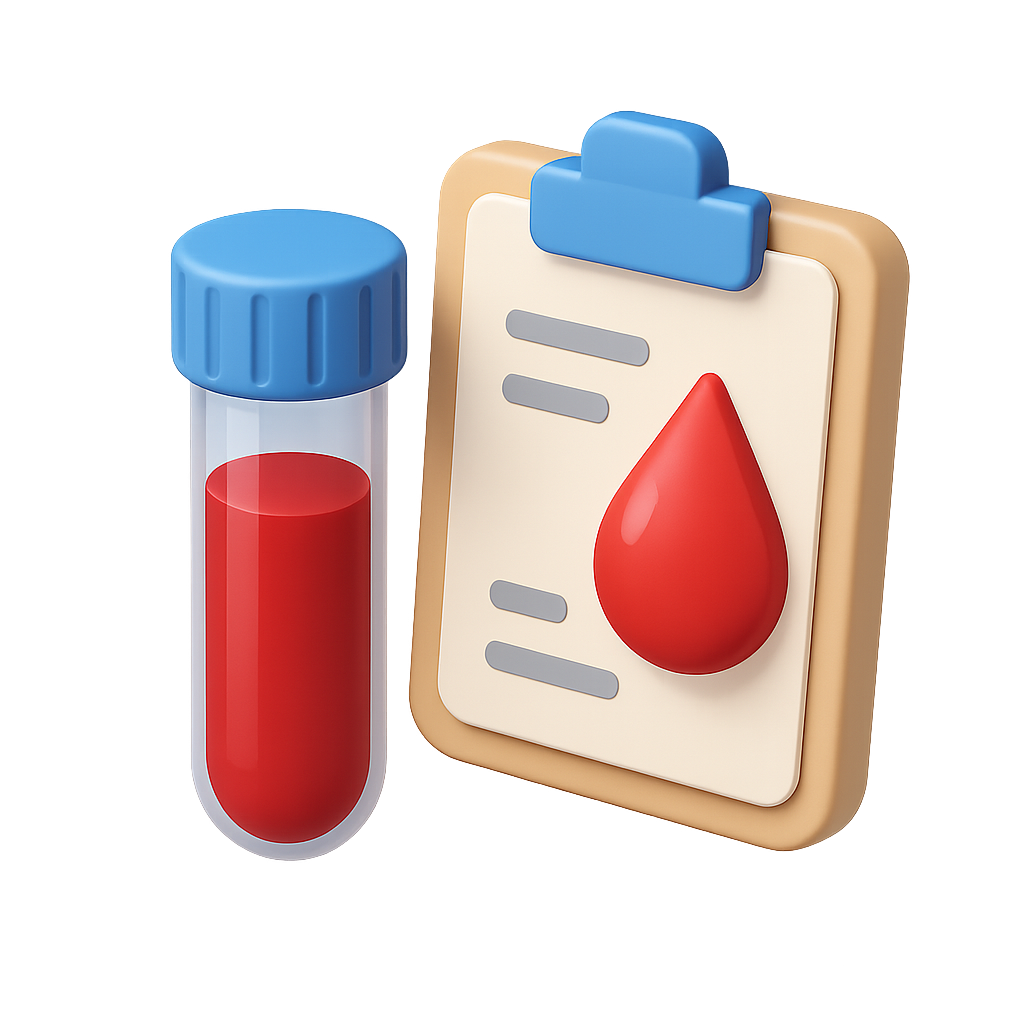 Stylized 3D Blood Test Icon with Test Tube and Clipboard
