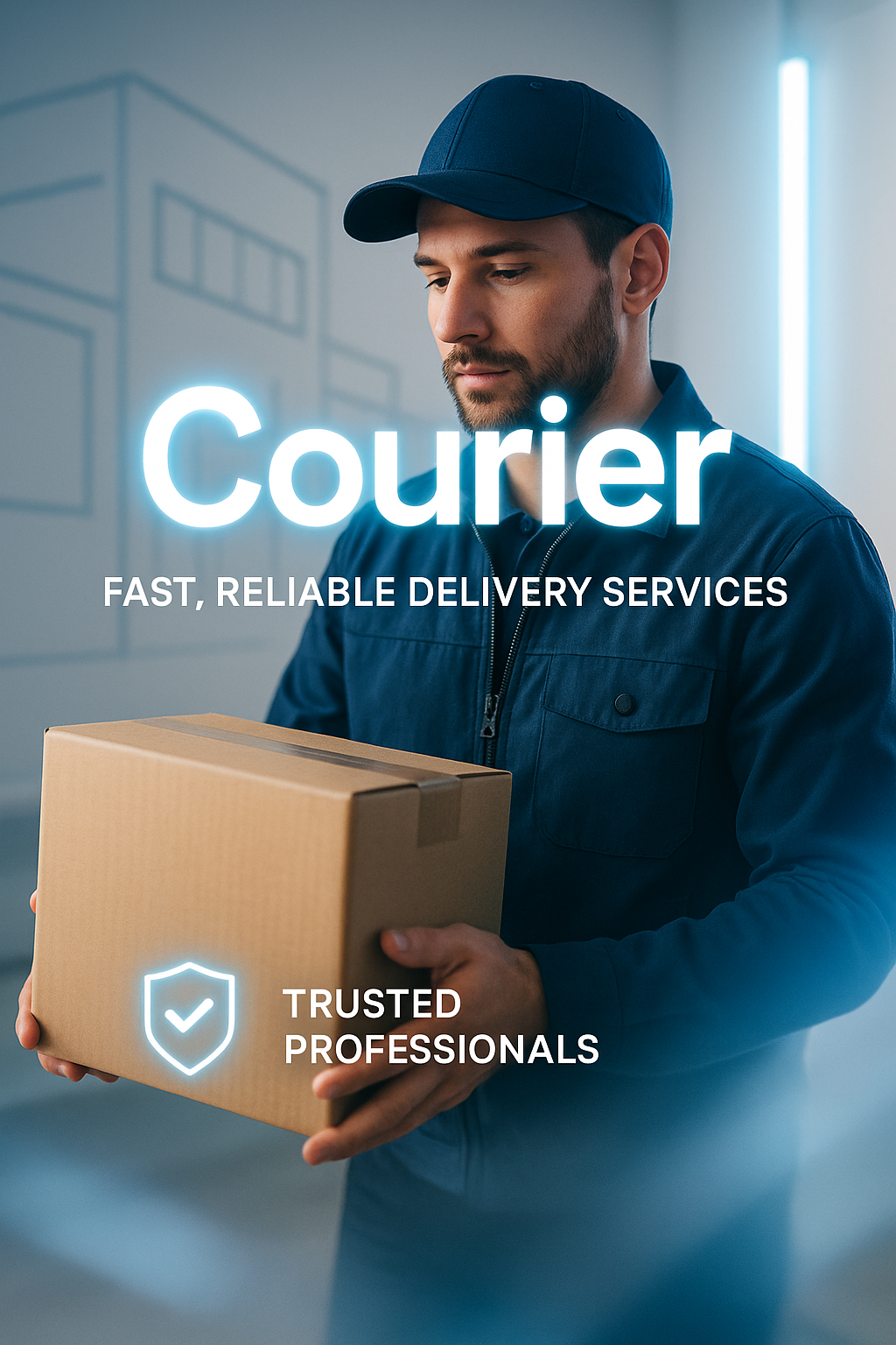 /Collection: /by davooda/Type: PNG/Promotional graphic for a courier service featuring a delivery professional holding a package. The modern design with glowing elements highlights reliability and trust, targeting customers in need of delivery services.