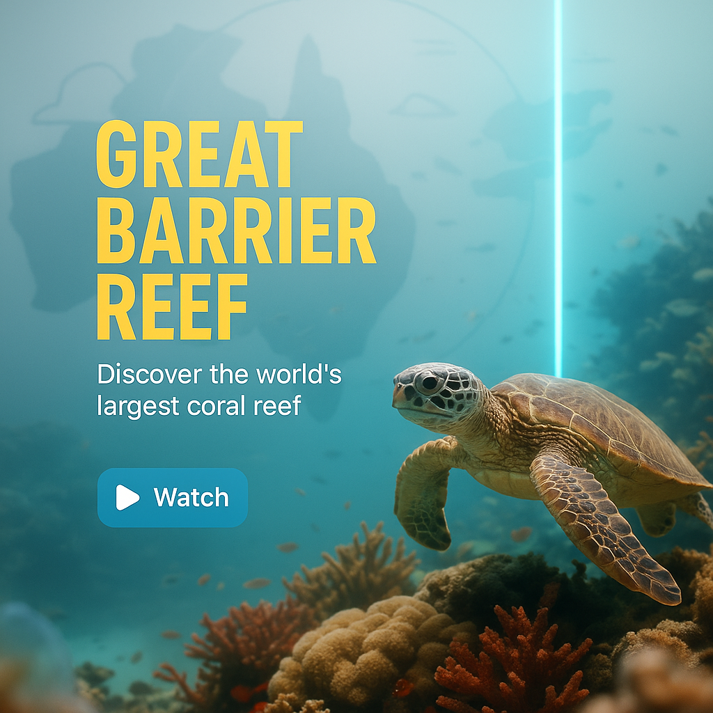 /Collection: /by davooda/Type: PNG/Engaging promotional image featuring a sea turtle amidst a coral reef, designed to encourage exploration of the Great Barrier Reef. Ideal for educational or tourism-related content.
