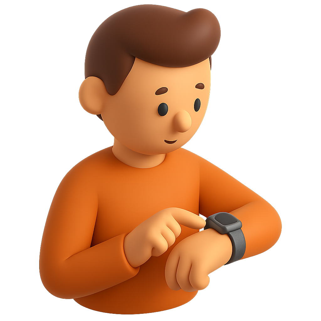 A stylized 3D icon depicting a person in an orange shirt checking their smartwatch. The design features a transparent background with a volumetric, isometric view.