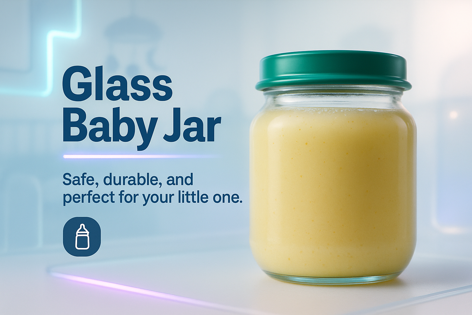 /Collection: /by davooda/Type: PNG/A sleek product mockup featuring a glass baby jar filled with a creamy substance, designed for marketing baby food. The modern aesthetic is suitable for e-commerce and promotional materials.