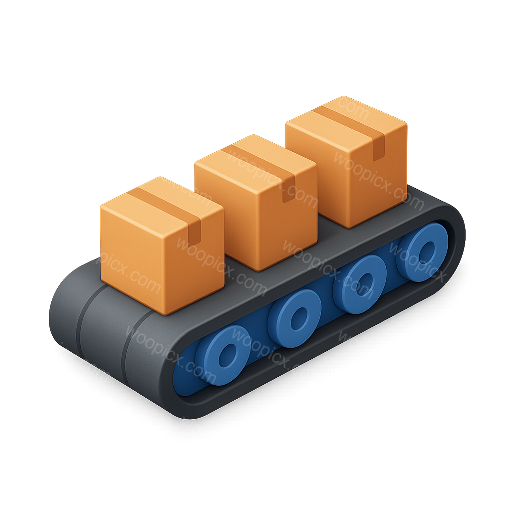 A three-dimensional isometric illustration of a conveyor belt carrying three orange boxes. The design features a sleek look with a transparent background, emphasizing a modern 3D feel.