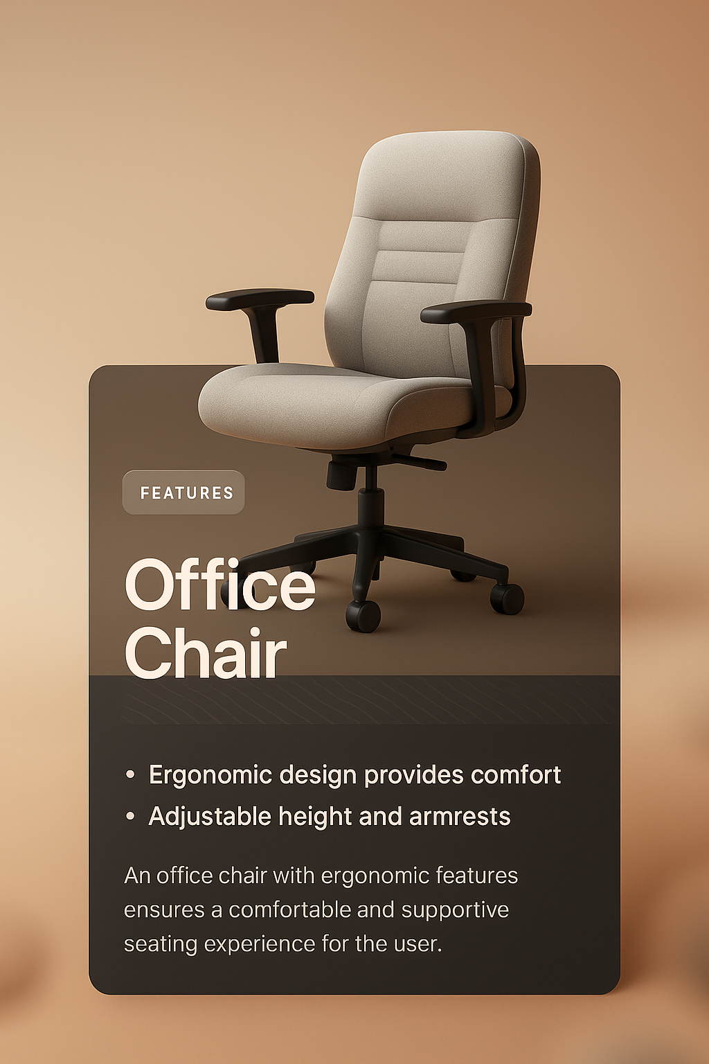 A 3D illustration of an ergonomic office chair against a smooth gradient background, featuring an integrated text block highlighting its adjustable height and comfort.