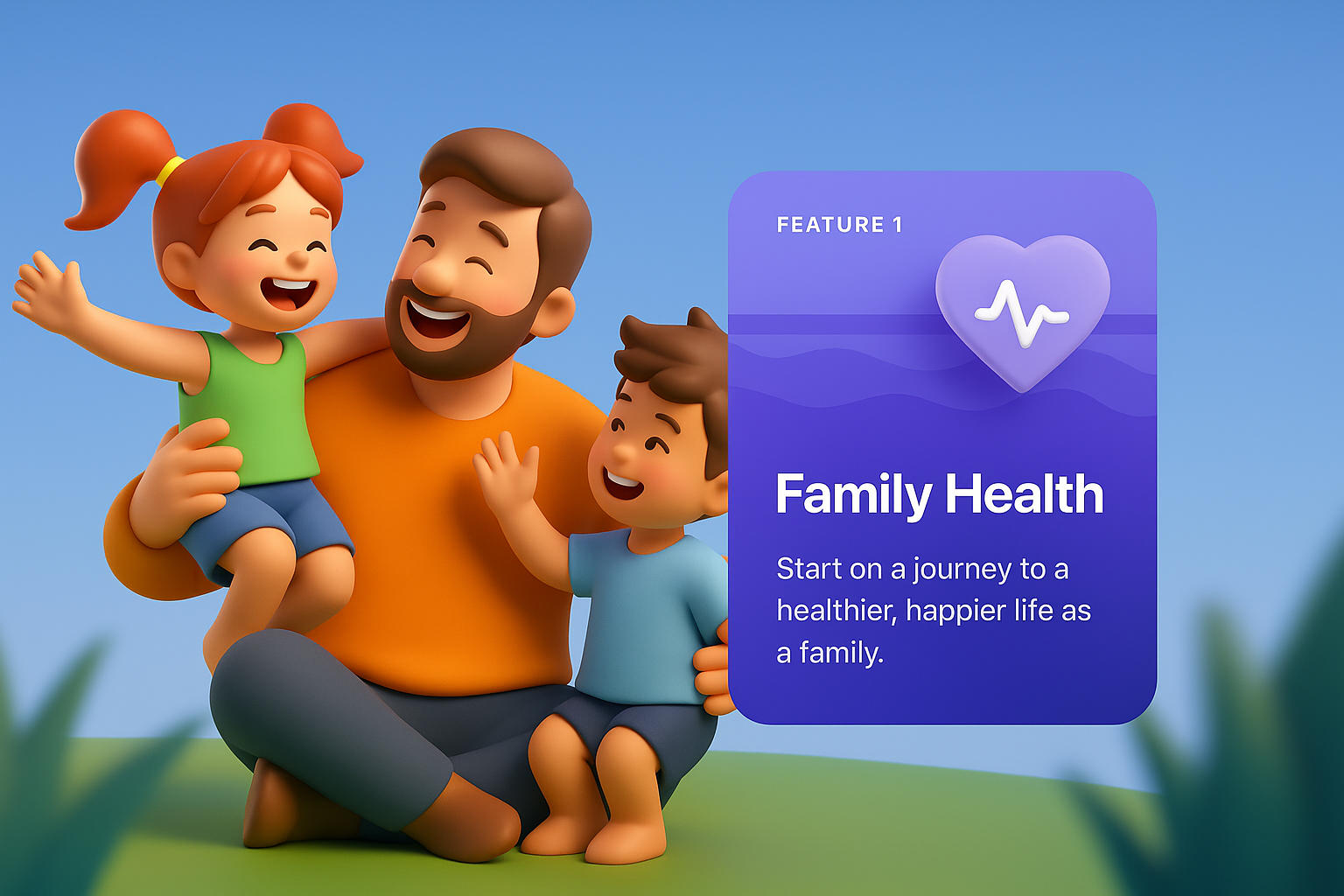 A joyful family moment captured outdoors, featuring a parent with two children. The vibrant, playful 3D illustration showcases happiness and togetherness.
