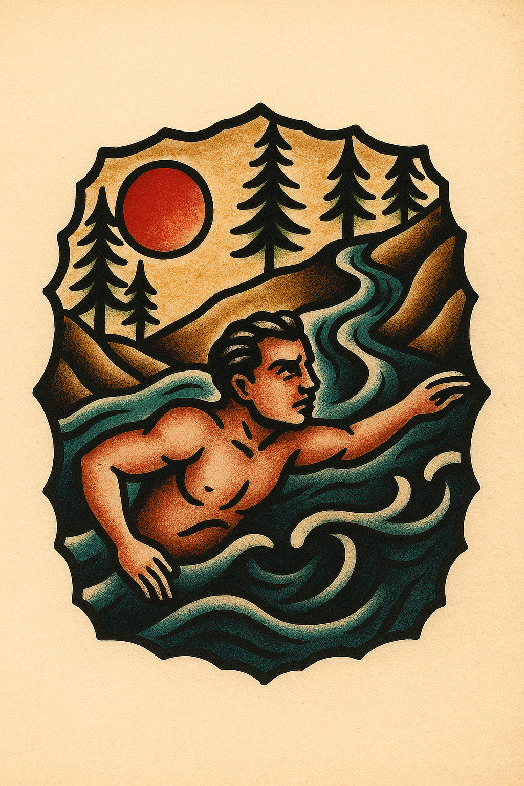 /Collection: /by davooda/Type: PNG/A classic tattoo design depicting a man swimming against a flowing river. The scene includes trees, a sun, and a subtle beige background, symbolizing resilience.
