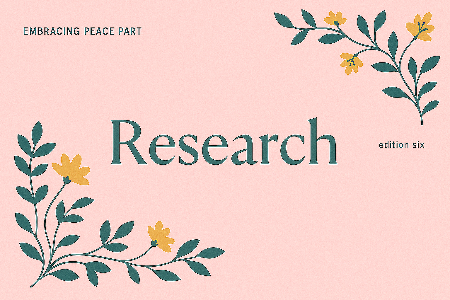 This image features a pastel pink background adorned with intricate floral patterns in green and yellow. The word 'Research' stands out in a bold font, complemented by elegant leaves and flowers.