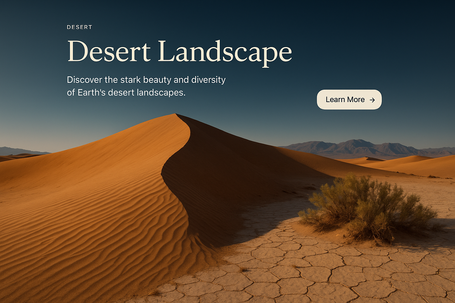 A stunning desert landscape featuring rolling sand dunes under a clear blue sky, highlighted by a text block and action button, ideal for web design.