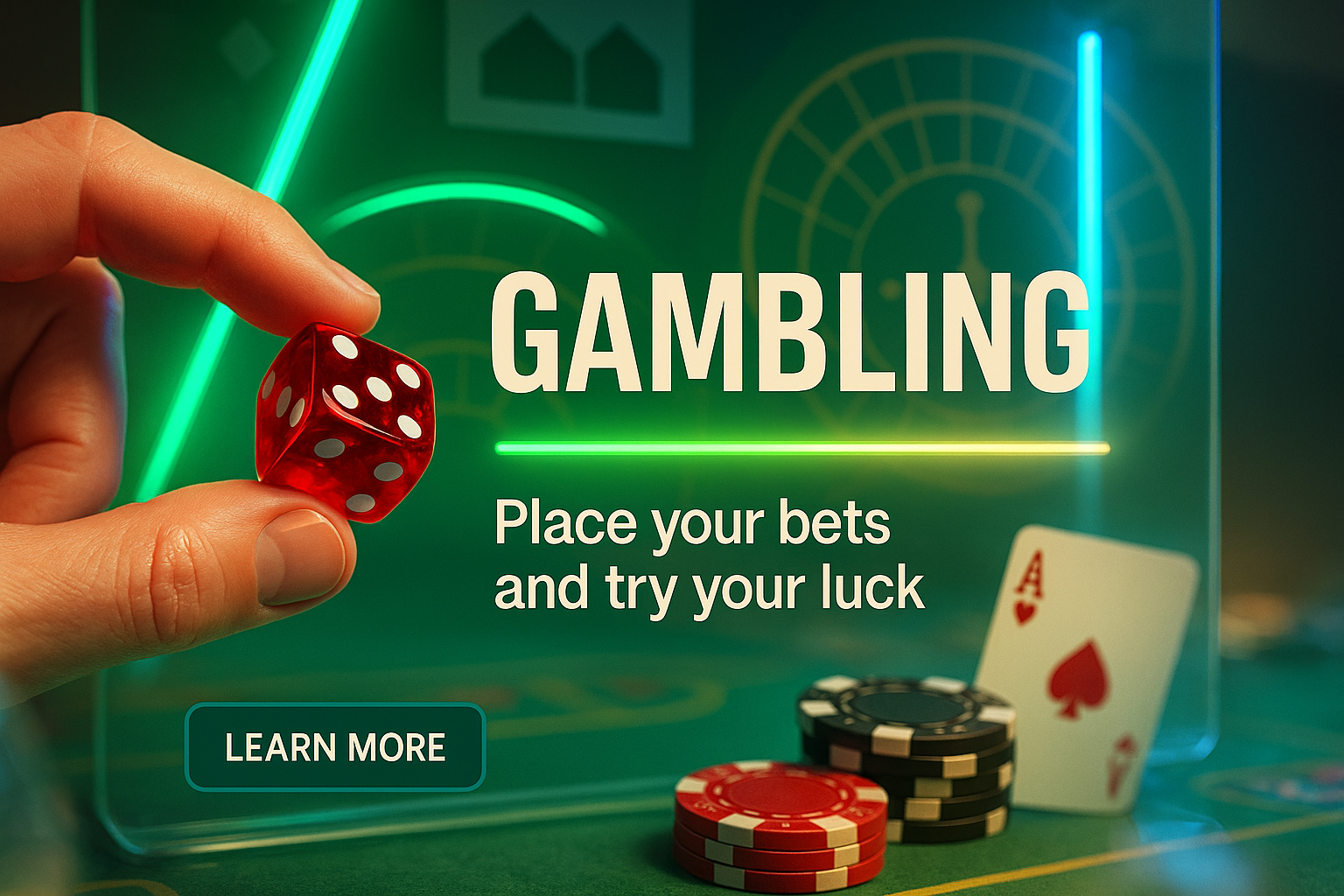 Engaging promotional graphic for gambling featuring a hand holding dice, poker cards, and chips, designed to attract players with a modern aesthetic.