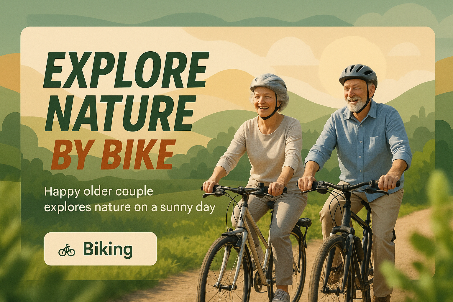 Vibrant promotional image featuring an older couple biking through nature, ideal for encouraging outdoor activities and exploration. The cheerful atmosphere makes it suitable for travel or lifestyle marketing.