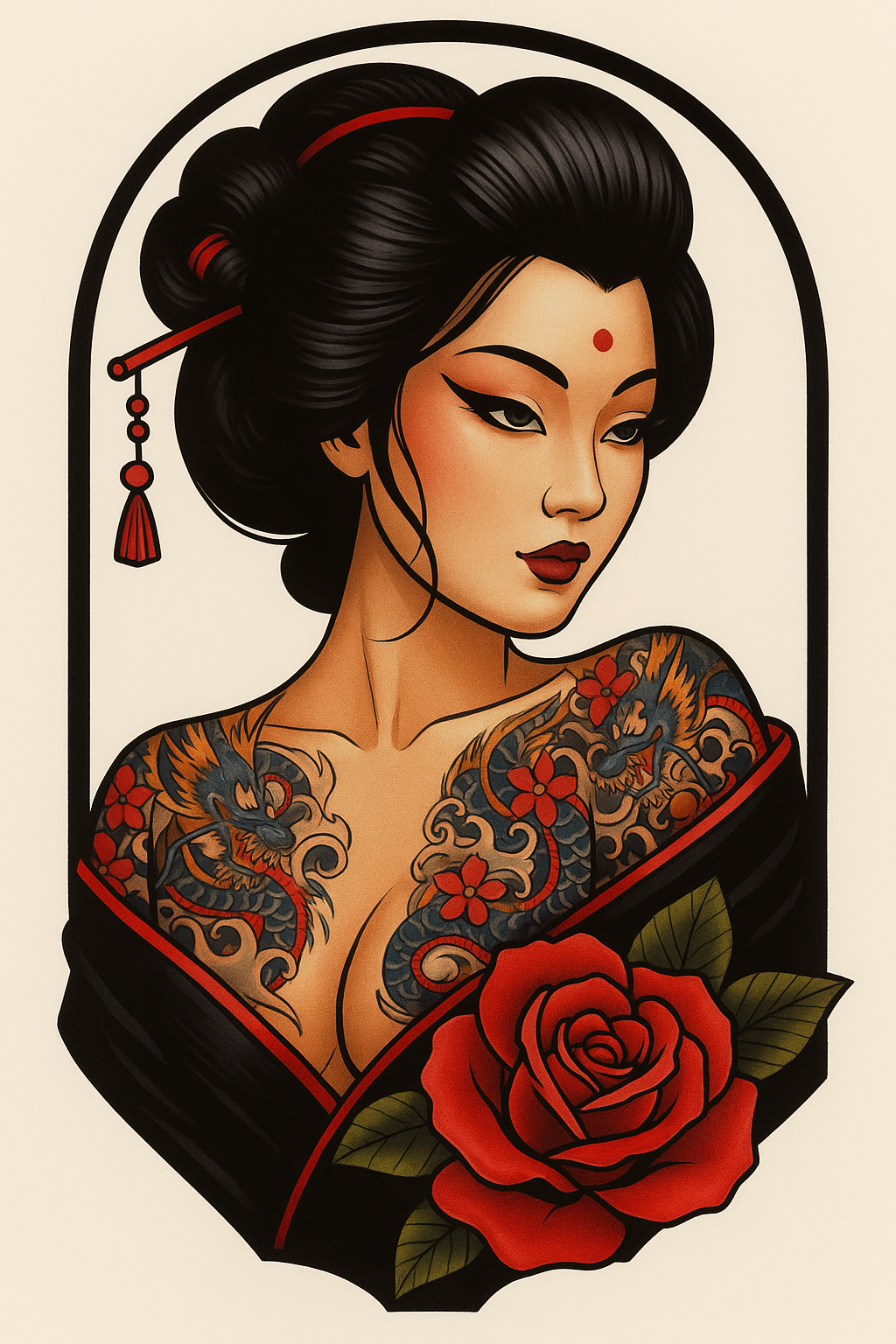 A beautifully illustrated tattoo-style image of a geisha in a kimono with open shoulders, adorned with intricate tattoos and a red rose. The composition mimics a tattoo design with clear borders.
