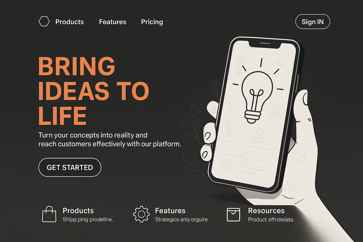 A sleek landing page layout featuring small typography, a sign-in button, and a smartphone displaying a lightbulb graphic. The design is modern and visually balanced.