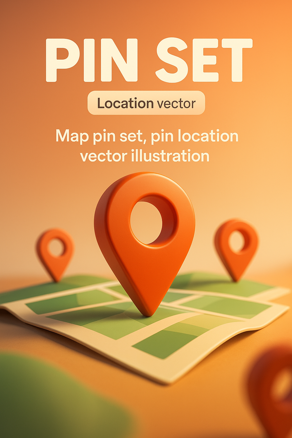 /Collection: /by davooda/Type: PNG/This image features a 3D illustration of map pins on a green map, designed for use in location-based services or apps. The warm color palette enhances its visual appeal.