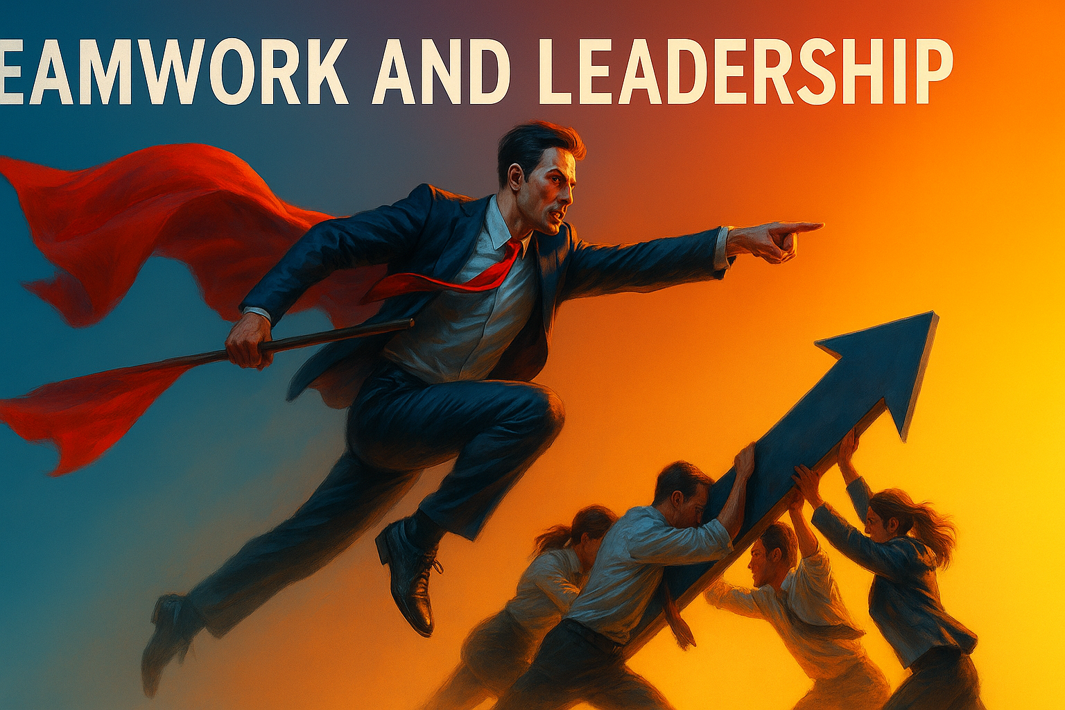 /Collection: /by davooda/Type: PNG/A striking depiction of teamwork and leadership featuring a man in a dynamic pose, leading his team towards success. The scene is illuminated with contrasting colors, enhancing the vibrant atmosphere.
