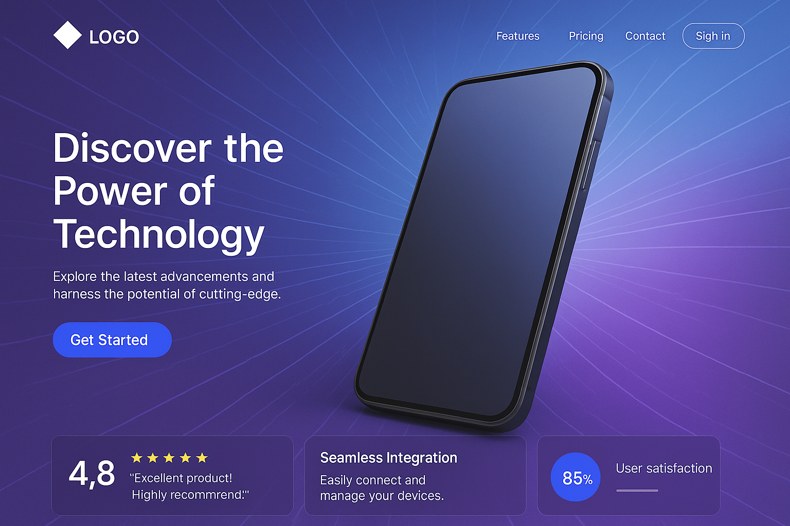 /Collection: /by davooda/Type: PNG/A visually striking landing page mockup featuring a black smartphone against a smooth gradient background. Key elements include a prominent logo, action button, and engaging content blocks.