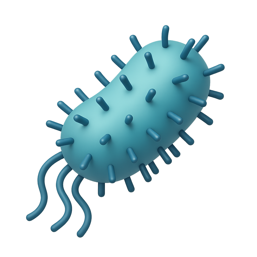 A three-dimensional illustration of a bacterial cell, featuring a rounded shape with protruding structures. The design has a transparent background, showcasing a volumetric and isometric perspective.