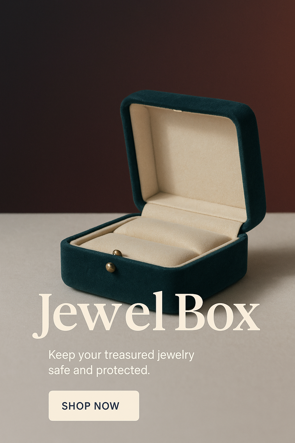 A stylish, luxurious jewel box with a soft interior, perfect for keeping jewelry safe. Features a clear call to action for shopping.