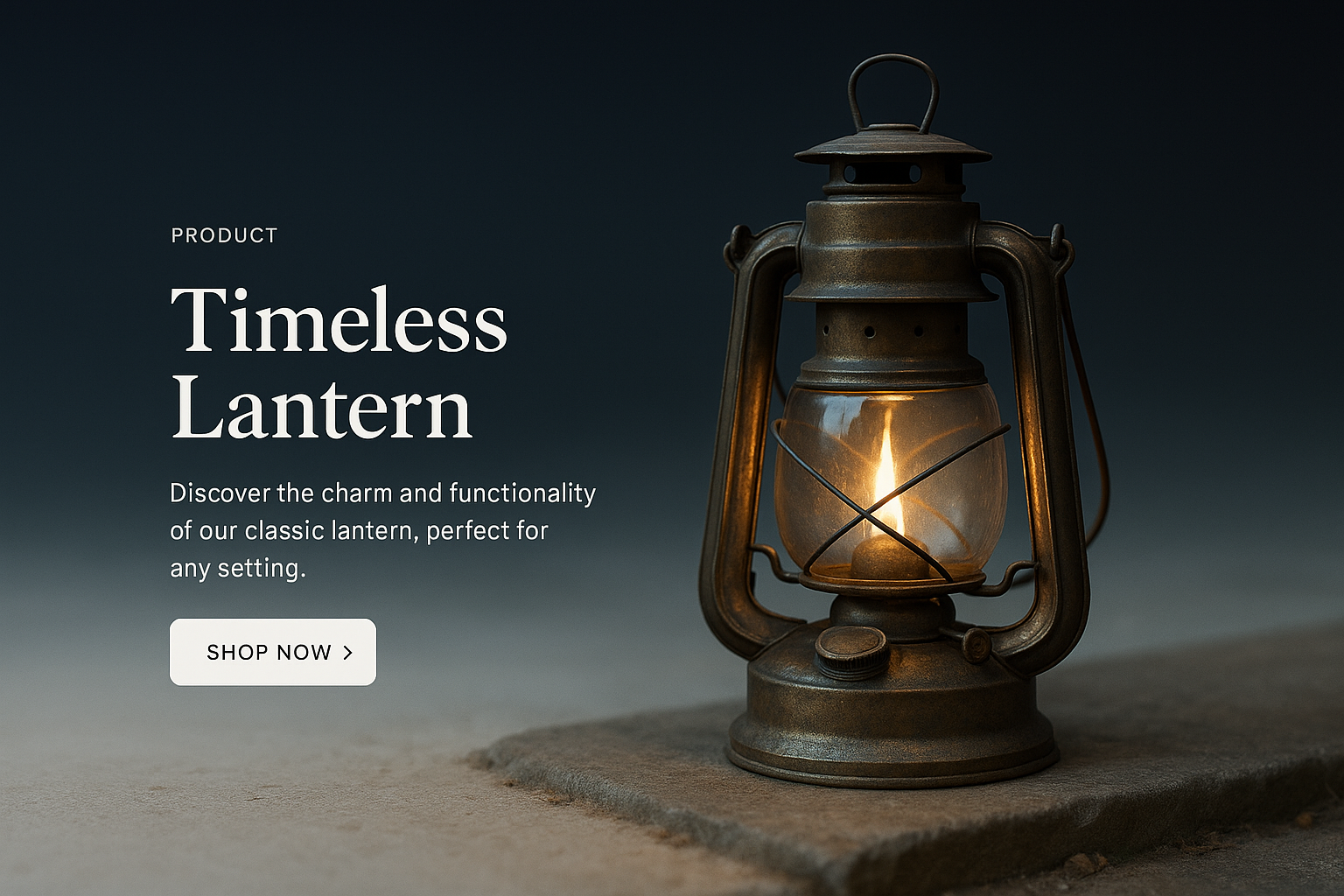 /Collection: /by davooda/Type: PNG/A beautifully crafted vintage lantern emits a warm glow, set against a dark gradient background. Accompanied by elegant text, inviting users to explore its charm.