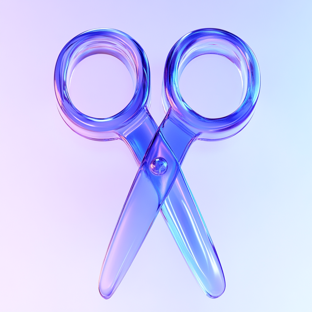 A contemporary illustration of scissors featuring a sleek, transparent design with a vibrant gradient, ideal for design projects or creative presentations.