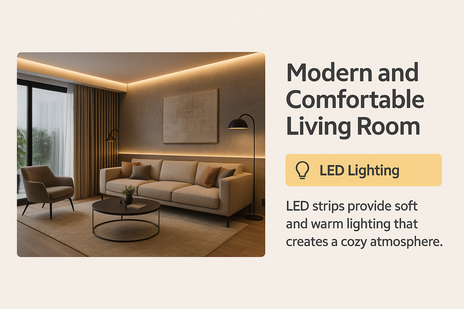 Stylish living room showcasing modern furniture and LED strip lighting, designed to create a warm and inviting atmosphere for home decor inspiration.