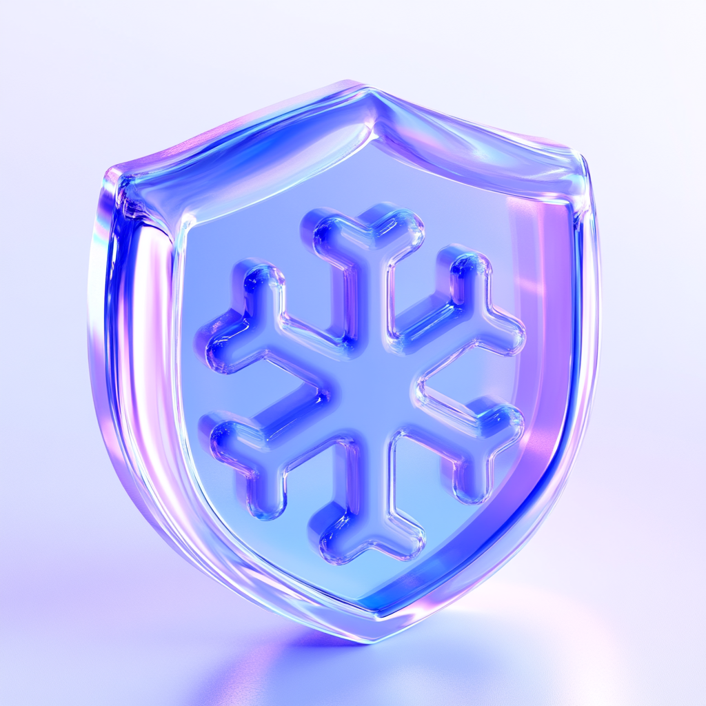 A modern 3D icon featuring a translucent shield shape with a snowflake motif, suitable for winter-themed applications or ice-related branding.