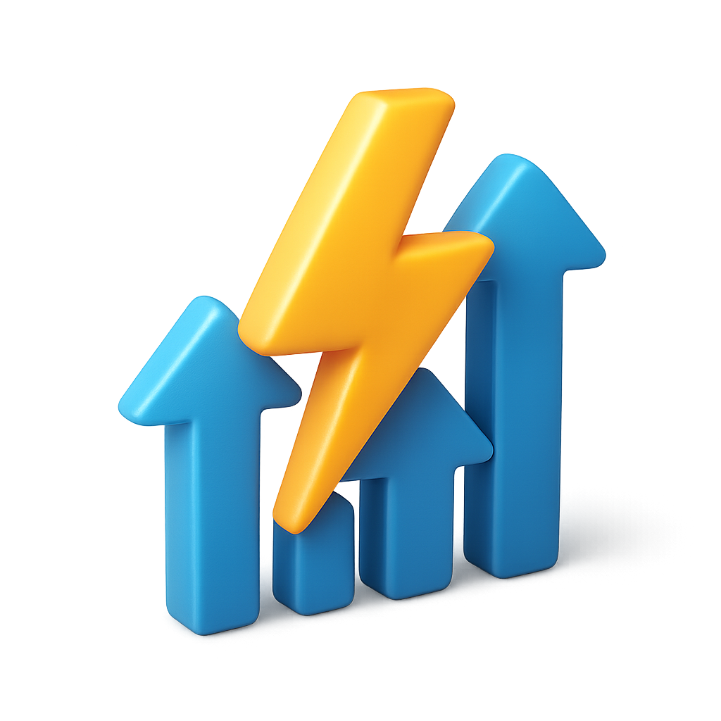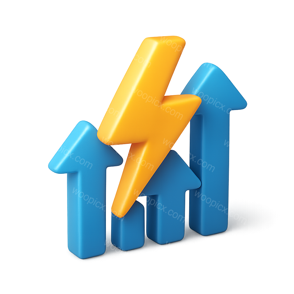 A vibrant 3D icon featuring upward arrows in blue and a yellow lightning bolt, designed with a transparent background and a three-quarter isometric view.