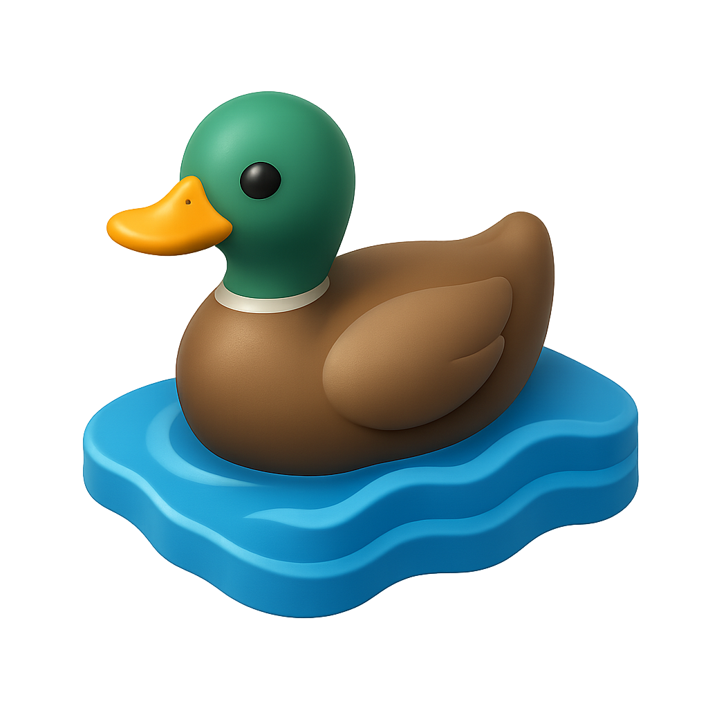 A vibrant 3D duck icon featuring a green head and brown body, floating on stylized blue water. The design is isometric with a transparent background.