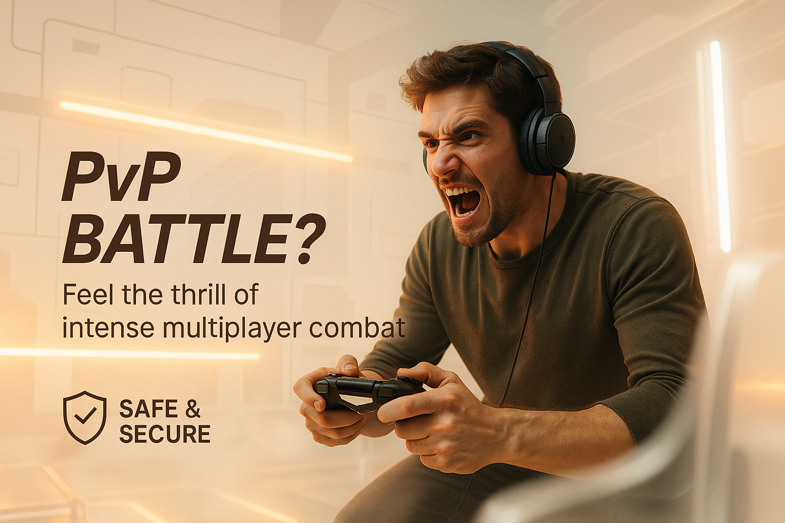 /Collection: /by davooda/Type: PNG/An energetic promotional banner showcasing a gamer in action, emphasizing the excitement of PvP multiplayer battles. Ideal for gaming advertisements or social media.